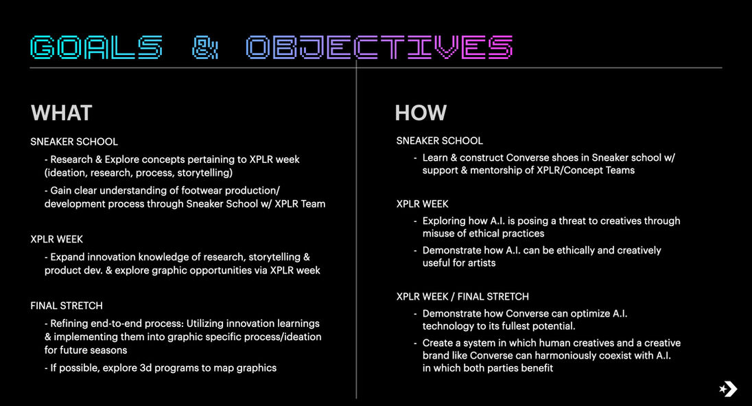 Working in collaboration with the Converse XPLR & Make Innovation team, I further explored footwear creation and development, how to collaborate with an outside artist while integrating artificial intelligence into the online Converse custom platform (CBY) in a way that does not disrupt the artists vision and identity as well as exploring linguistics and A.I. as a means to improve communication and workflow between Product Managers and Design teams across categories.